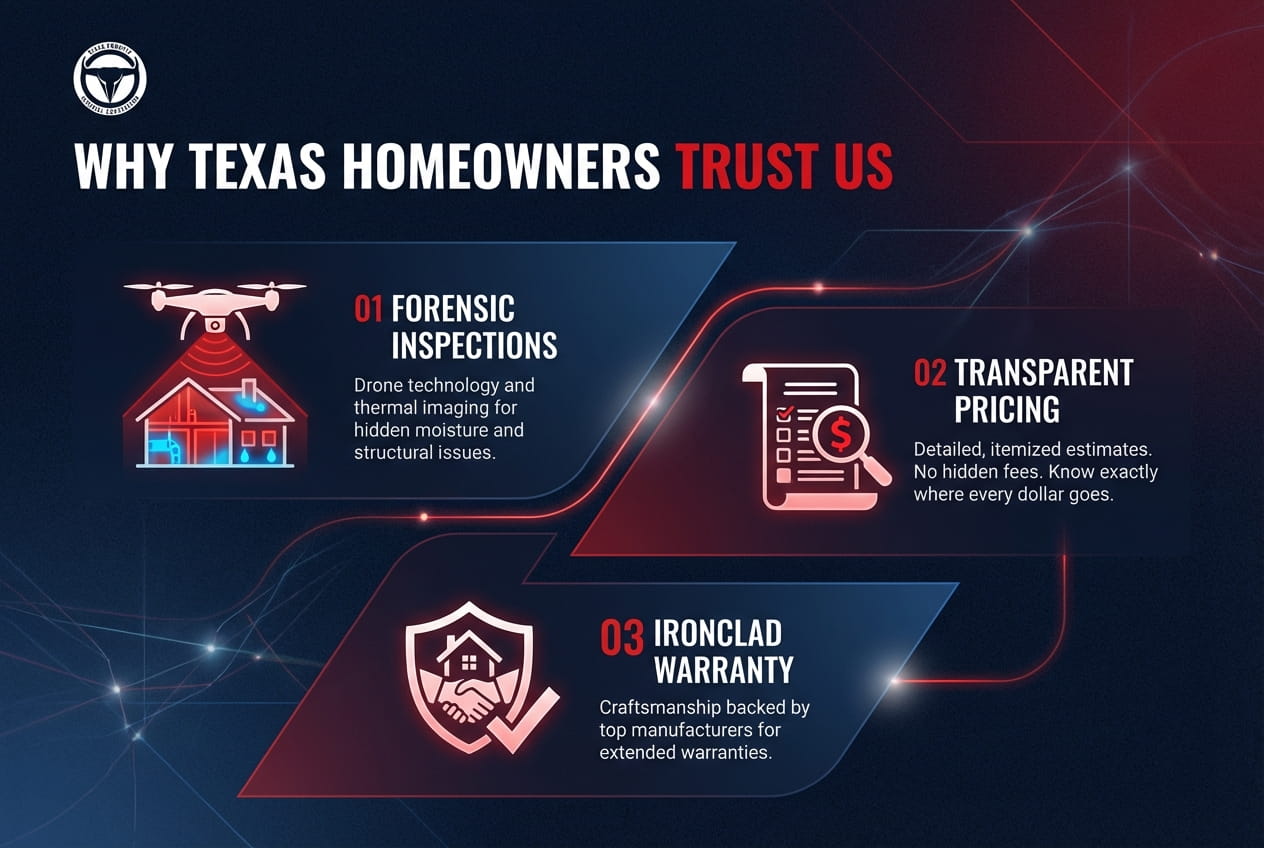 Premium roofing systems for residential and commercial properties. We deliver craftsmanship that withstands the toughest Texas weather.